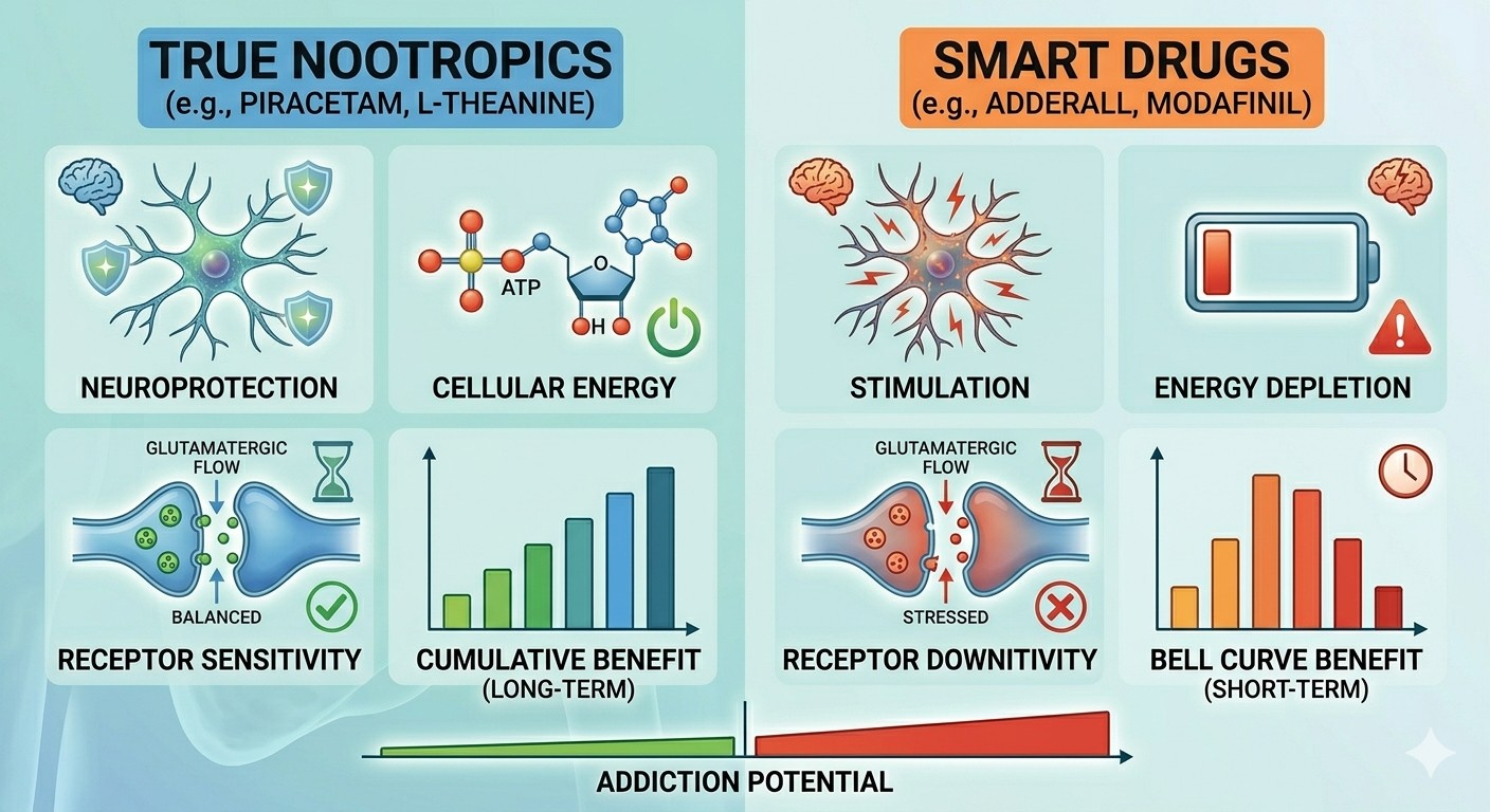 Než začneme, musíme si vyjasnit pojmy. Problém dnešní doby je, že média (a bohužel i někteří „odborníci“) hází všechno do jednoho pytle. Pro ně je Piracetam to samé co Adderall. To je nebezpečný nesmysl.