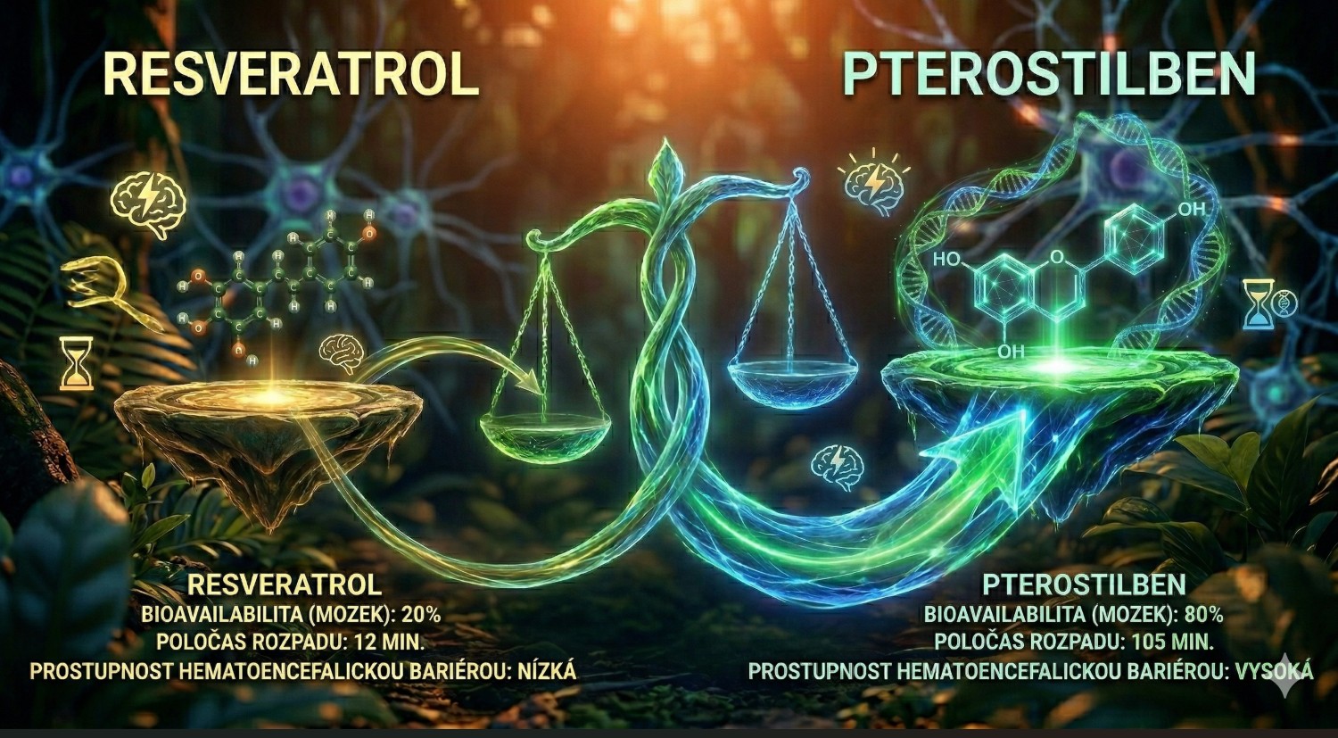Alzheimerova choroba: Srovnávací studie na Case Western Reserve University ukázala, že Pterostilben je v boji proti kognitivnímu úpadku a projevům Alzheimerovy choroby výrazně účinnější než resveratrol. Při testování na modelech předčasného stárnutí (myši SAMP8) vedla dvouměsíční suplementace Pterostilbenem k zásadnímu zlepšení prostorové paměti a orientace. Klíčem k tomuto úspěchu je schopnost Pterostilbenu pozitivně modulovat markery zánětu a buněčného stresu skrze zvýšenou expresi receptoru PPAR-alfa (kódovaného genem pPARA). Díky své vynikající biologické dostupnosti a schopnosti snadno překračovat hematoencefalickou bariéru funguje Pterostilben jako silný regulátor genové exprese, což z něj činí mnohem efektivnější nástroj pro ochranu mozku než jeho známější příbuzný. [4]